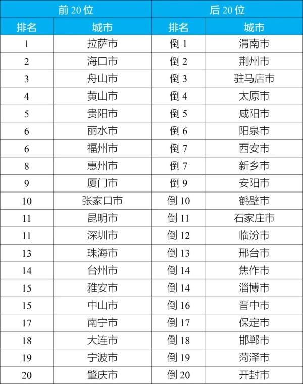 2022年10月168个重点城市空气质量排名前20位和后20位城市名单